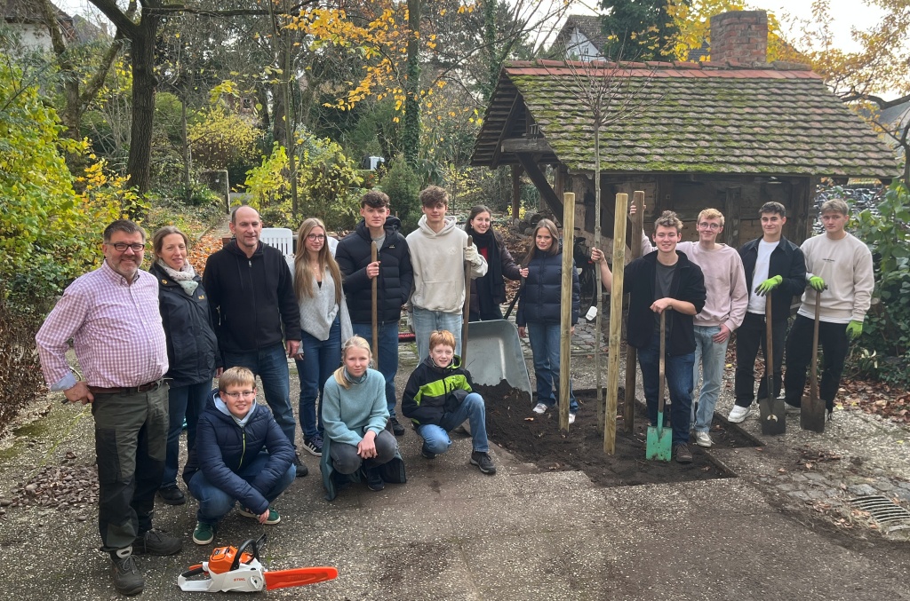 So griffen jetzt im November hoch motivierte Schülerinnen und Schüler des künftigen Abiturjahrgangs 2026 zu Schaufel und Spaten, entfernten die Wurzelreste und hoben ein großes Loch für eine Ersatzpflanzung aus. Thomas Baltz, der als Mitarbeiter des Landkreises Bergstraße für Tausende von Schulbäumen verantwortlich ist, begleitete die Pflanzaktion sachkundig und hatte dafür einen bereits ansehnlichen Kugelahorn, der den Nussbaum ersetzen soll, mitgebracht. Auch die Biotop-AKG des AKG Bensheim unter der Leitung der Biologielehrerin Susanne Dönicke unterstützte die Abiturienten bei ihrem Einsatz für Nachhaltigkeit, Klimaschutz und Biodiversität.