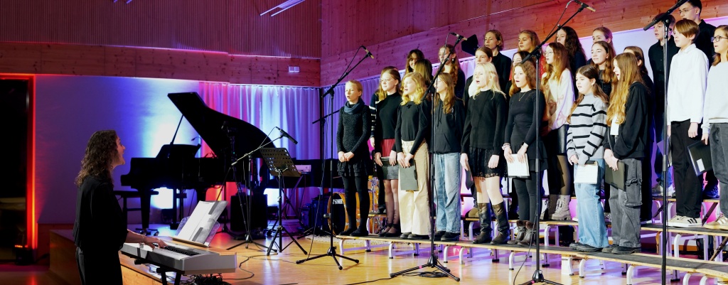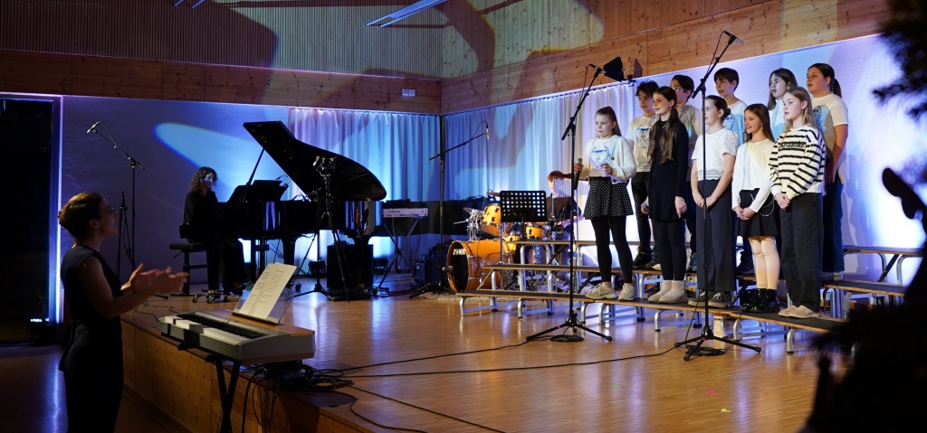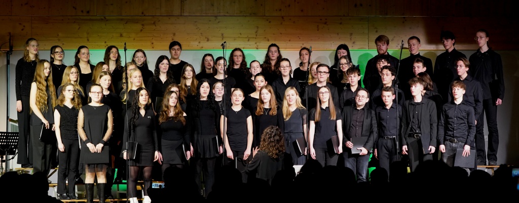 Den Auftakt machte der Chor der 5. und 6. Klassen unter der Leitung von Gregor Knop. Der Regionalkantor, ein erfahrener studierter Schul- und Kirchenmusiker, führte das Unterstufenensemble in bemerkenswerte klangliche Sphären, ohne den jungen Stimmen die Leichtigkeit zu nehmen. Das fragile „Maria durch ein Dornwald ging“ ist ein Adventslied, dessen Melodie wahrscheinlich aus dem 16. Jahrhundert stammt. Eine Allegorie auf die Hoffnung, die mit der Menschwerdung Gottes verbunden ist, wenn ein abgestorbener, laubloser Wald angesichts der Präsenz Marias mit dem göttlichen Kind zu blühen beginnt. Das leise Stück erstrahlte in der Mensa in stiller Kraft und bahnte sich trotz großem Auditorium seinen Weg bis in die hinteren Reihen.