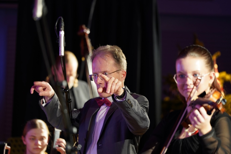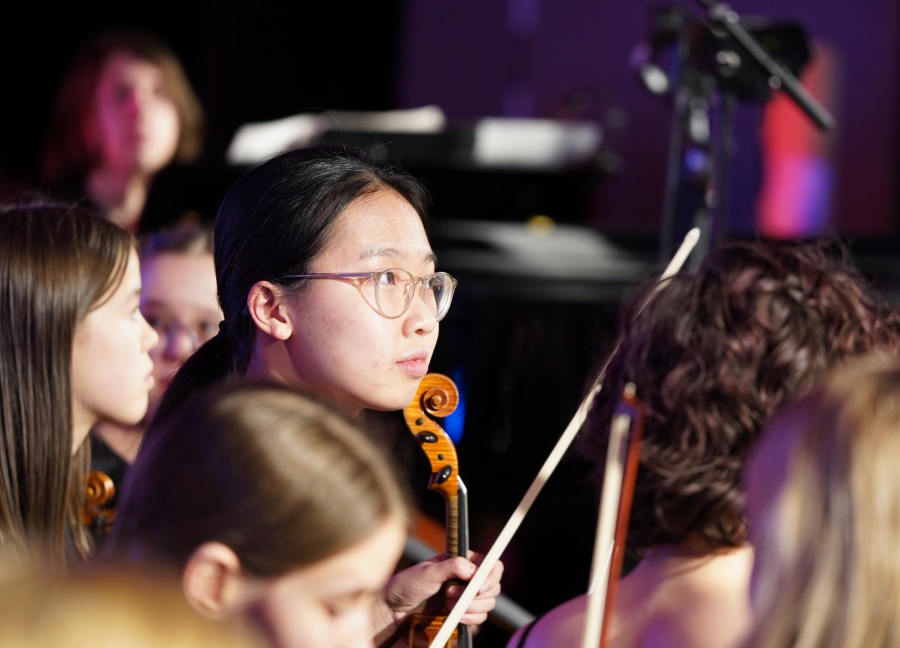 Den Auftakt der zweiten Hälfte bildete das Vororchester, diesmal unter der Leitung von Charlotte Schlichter. Bestehend aus den Schülerinnen und Schülern der Sexta und Quinta war es für einige der erste große Auftritt auf einer Bühne. Dafür agierten die jungen überaus souverän und bildeten eine direkte Brücke zum Orchester von Gundolf Aisenpreis. Aus dem Märchen-Ballett „Der Nussknacker“ von Pjotr Iljitsch Tschaikowski, 1892 uraufgeführt, erklangen Auszüge aus der berühmten Suite – farbig orchestriert und besonders plastisch dargeboten. Darunter der „Tanz der Zuckerfee“ und der „Russische Tanz“. Die Suite spiegelt weihnachtliche Vorfreude: Da marschieren Zinnsoldaten, tanzen Schneeflocken und verwandelt sich ein Nussknacker in einen zauberhaften Prinzen. Und weil sich das AKG-Orchester nicht nur sicher in dieser märchenhaften Dramaturgie bewegt, sondern auch Sinn für dramatische, aber klug inszenierte Brüche hat, beendet es seinen Auftritt mit einem Zitat aus der von Kritikern hochgelobten Filmmusik von „Interstellar“. Der Soundtrack des epischen Science-Fiction-Werks stammt von Hans Zimmer und übt sich in poetischer Stille und emotionaler Pracht. Kein monumentales Gedonner und keine aufblitzenden Klangkaskaden, sondern eine langsame, zerbrechliche Melodie über einen Vater und seine Beziehung zu seiner Tochter in einer dystopischen Zukunft.