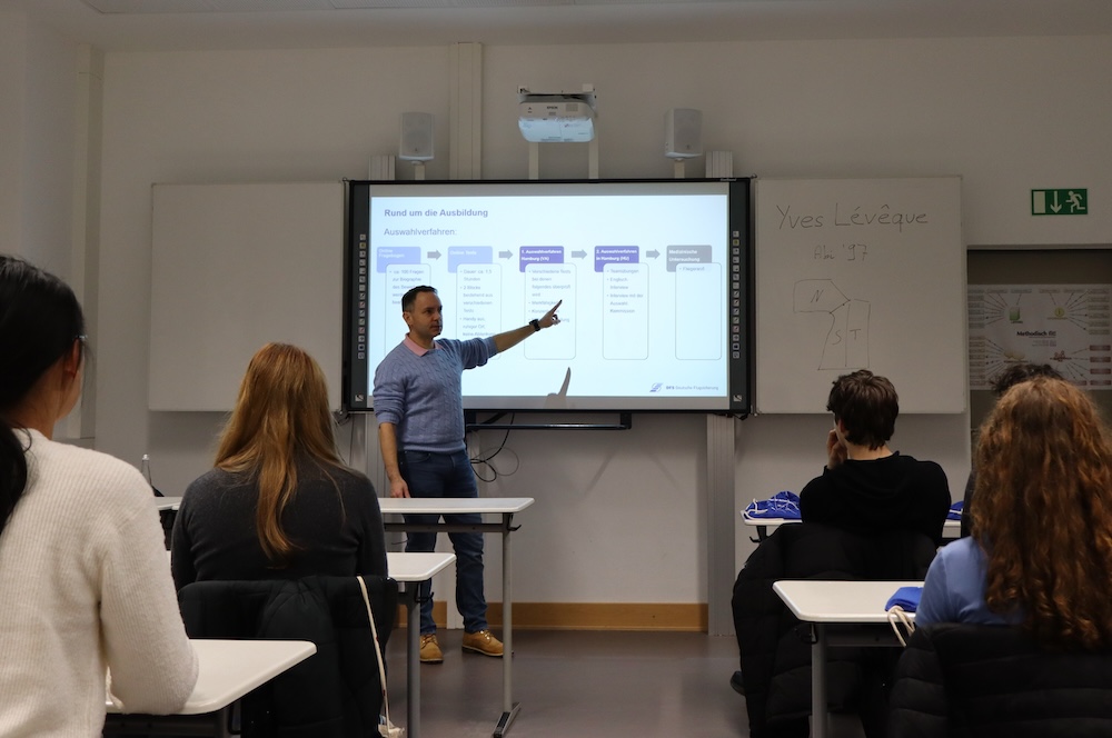 Die Fluglotsen-Ausbildung startet mehrmals jährlich, idealerweise sollte man ein Jahr vor dem Ausbildungsstart anklopfen. Im letzten Jahr wurden 146 Azubis aufgenommen. „Der Bedarf ist enorm“, so Leveque. In den ersten fünf Monaten lernt man den Funkverkehr mit den Piloten, später folgt ein praktisches Training im Simulator. Danach geht es gleich an den späteren Arbeitsplatz in einer der Kontrollzentralen oder in den Tower. Schon beim Praxisteil gibt es 5000 Euro im Monat. Es locken viele Benefits und Zusatzleistungen, so der Ehemalige im Klassenzimmer. Zahlreiche Schüler aus den Klassen neun bis 13 haben das Angebot genutzt. „Hier wird man nicht mit Werbeprospekten zugemüllt, sondern erfährt alles, was man wirklich wissen muss“, so eine Schülerin auf dem Weg zur Ärztin. Gesundheitlich ist alles ok, aber das Medizinstudium reizt.