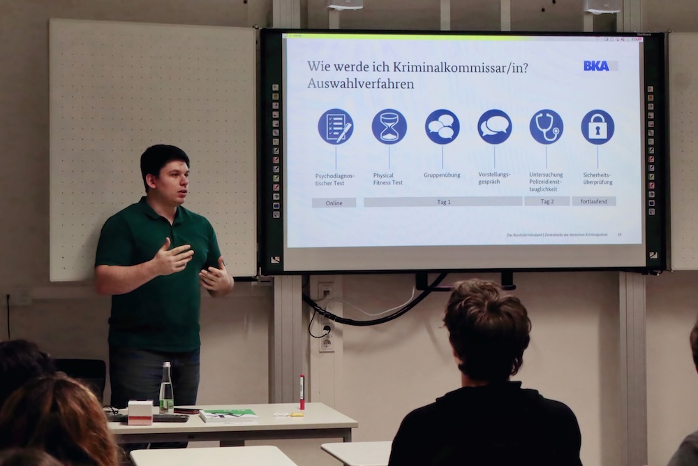 Es war sein sechstes Gastspiel an der alten Schule. Alexander Martin informierte über das dreijährige duale Studium, das man mit einem Notendurchschnitt von mindestens 2,8 beginnen kann. Zu den Einsatzbereichen zählen etwa Cybercrime, Korruption, organisierte Kriminalität oder Terrorismus. Körperliche und mentale Fitness sind wichtig. „Eine spannende Aufgabe“, bestätigt der Kommissar, die aber mit dem „Tatort“-geprägten Polizeibild der Menschen wenig gemein habe.